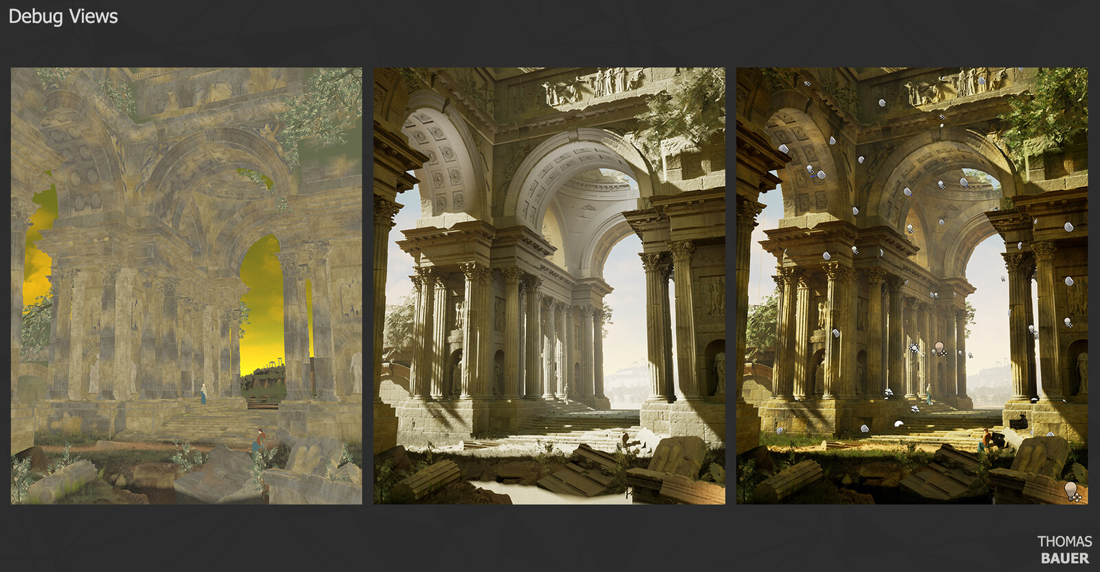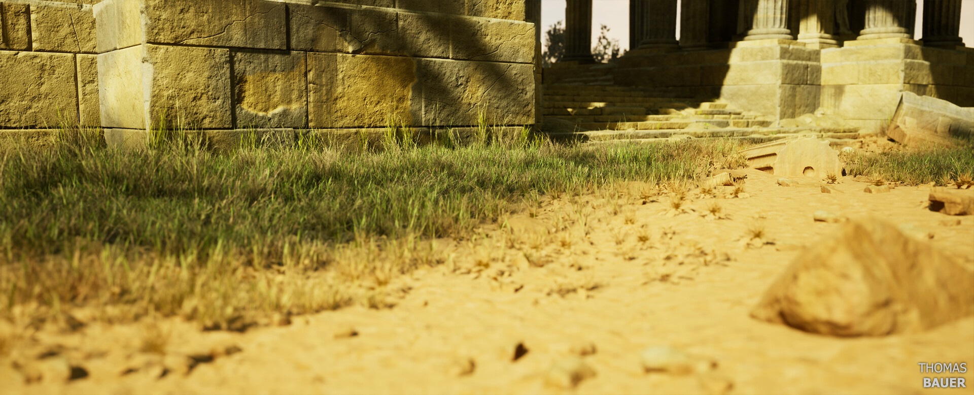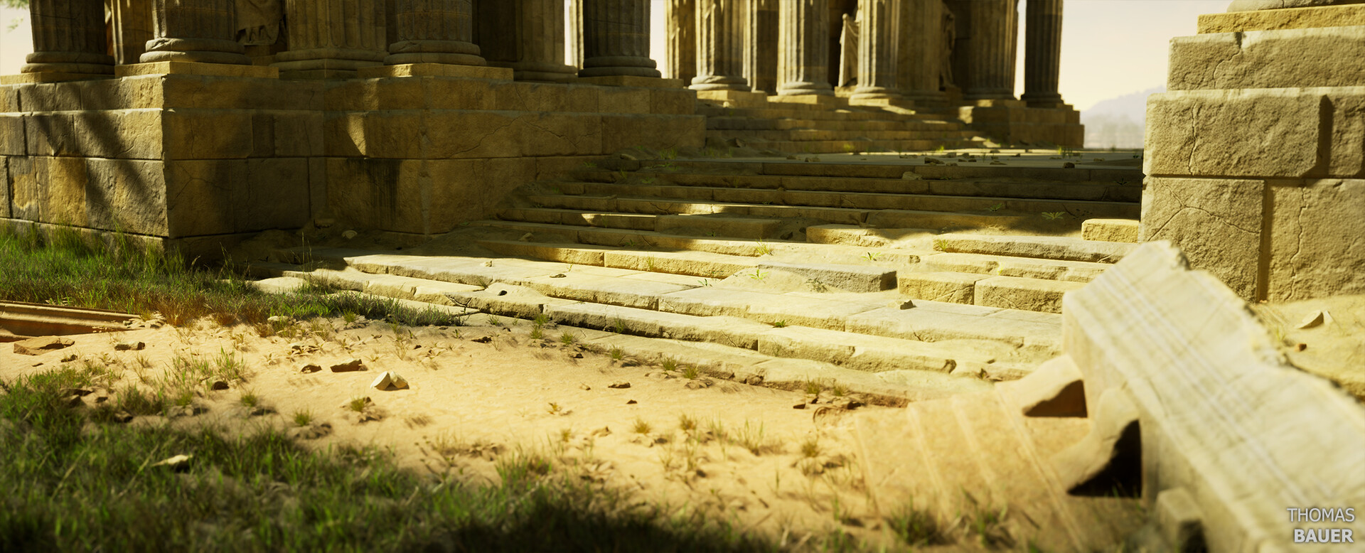 I tried to match the reference painting "Un temple en ruine" by french artist Pierre-Antoine Demachy from the 18th century as closely as possible while also taking a few liberties to ensure an efficient modular workflow.